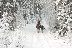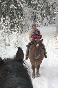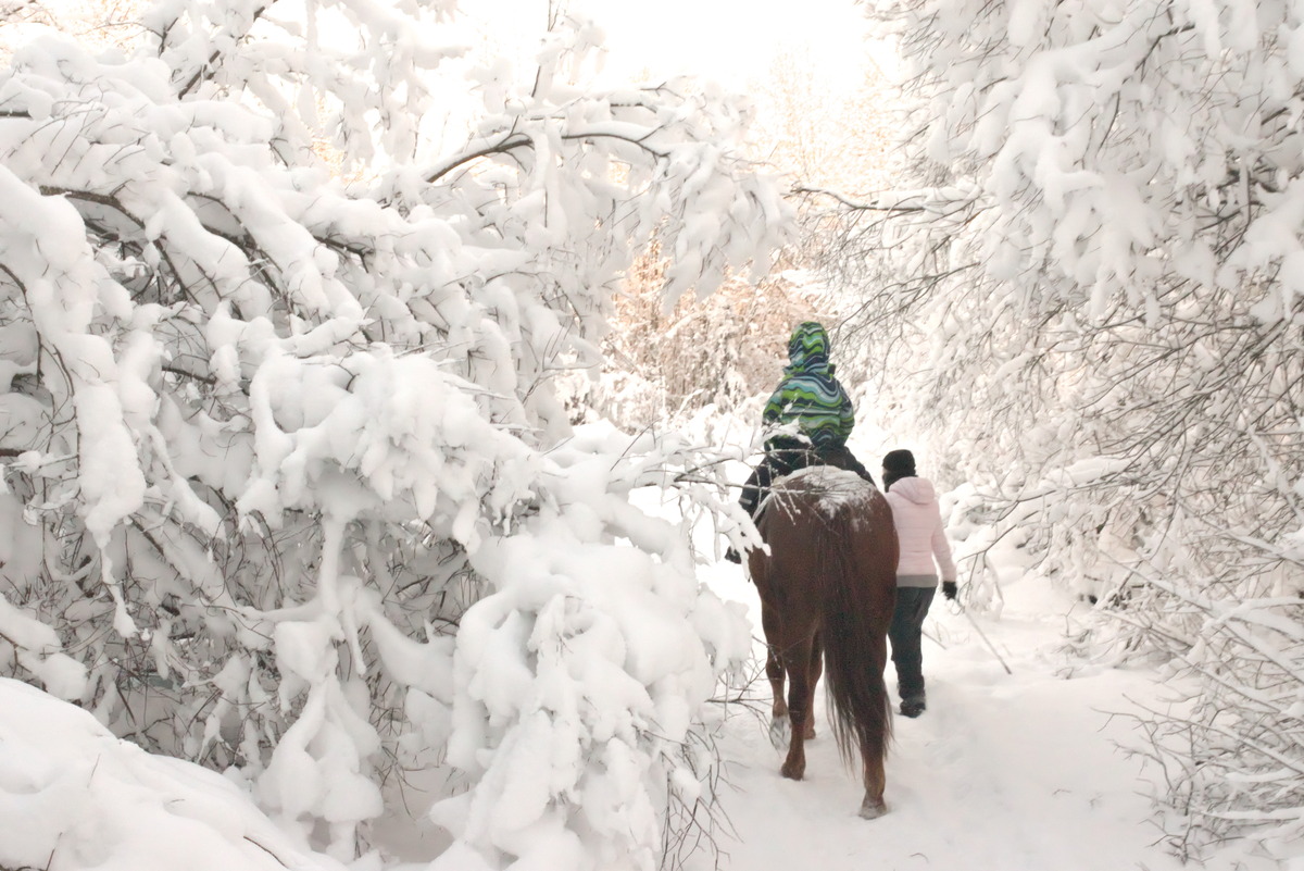 Ещё одна старая идея: нормально покатались на лошадях. Не как в парке "покатайте ребёнка на пони", а часовая прогулка по лесу на ухоженных лошадях из приличной конюшни. Я успел посмотреть немного инструкций об управлении лошадью и, похоже, начало даже получаться. Знаю про шенкели и удивил инструкторшу тем, что правильно держу поводья (это было одним из немногих моих достижений). Сева шёл на своей отдельной Атаманке с проводником, я пытался рулить своим Абесинтом со звездой во лбу, а Маша с Ксюшой были на коренастой и мохнатом карельском Листопаде. Море радости и отмороженные ноги.