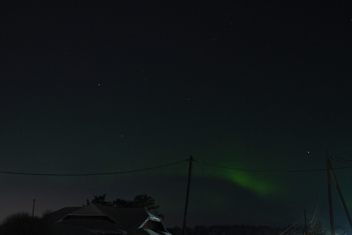 Я наконец-то закрыл свою давнюю мечту: увидел Полярное сияние. В ночь, когда оно по прогнозам должно было быть, каждые полчаса бегал на улицу и смотрел на север. И вдруг действительно увидел зелёные пятна: это не те огромные фантастические узоры во всё небо, но оно! Я бегал вокруг со штативом, фотографировал. Даже разбудил Севу, замотал в одеяло и вывел на крыльцо посмотреть: он не очень оценил и вряд ли запомнил. Интересно, что оно медленно, но меняется: как бы неподвижное, но отвлечёшься на перенастройку фотоаппарата, а оно уже другое.