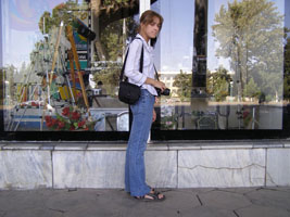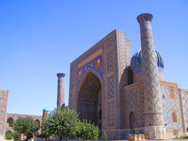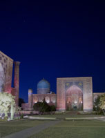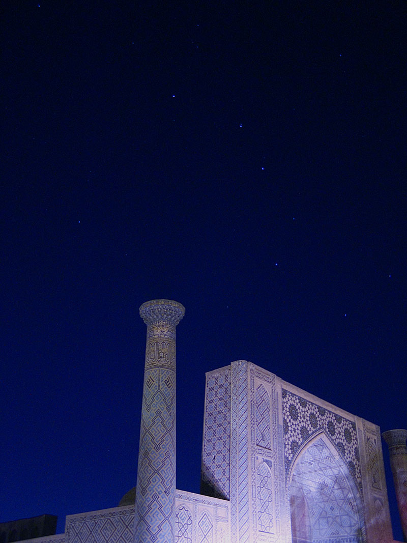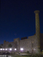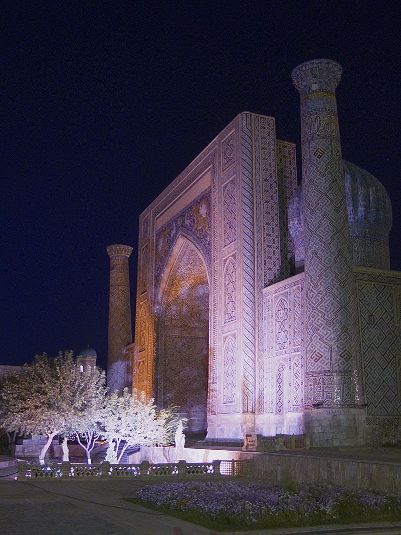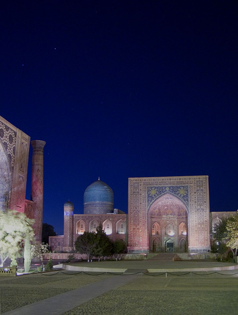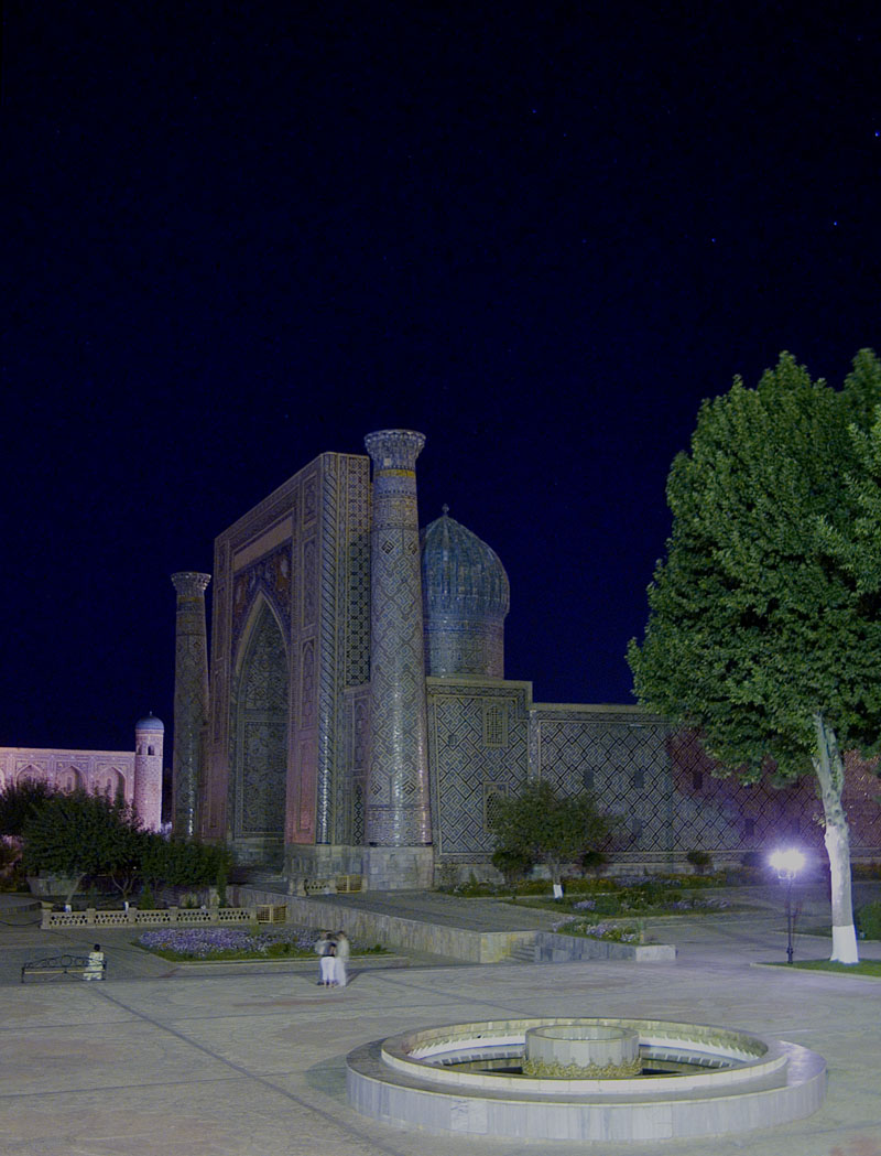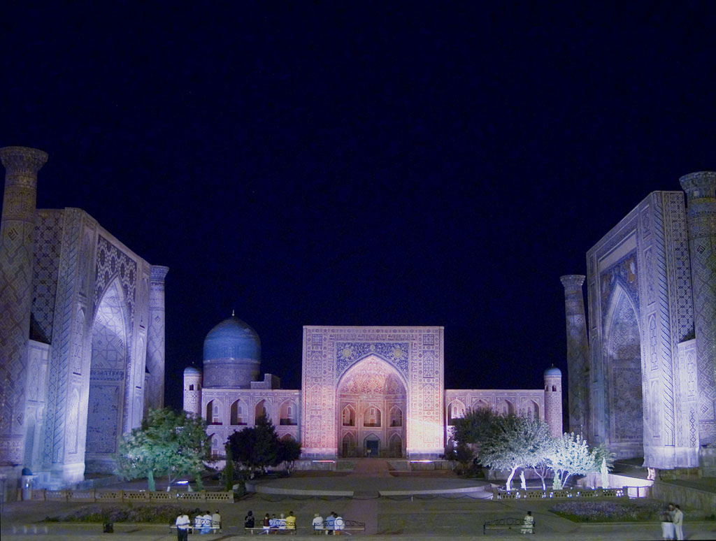 Красотища! Регистан после захода солнца. Включена разноцветная иллюминация, очень красиво. Для иностранцев один умелец устраивает светопредставление: включаются разные огни, из динамиков доносится некий рассказ об истории Самарканда. Временами рассказ превращается в диалог двух минаретов: правого и левого. :) Никогда не забуду пафосный голос "Регистана, говорящего о себе по-французски": "Je suis le Registan. Je situe dans la coeur du Samarkand". :) Как раз иностранцы сидят там на скамейке, испуганно жась в кучку. :)