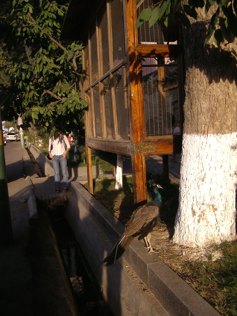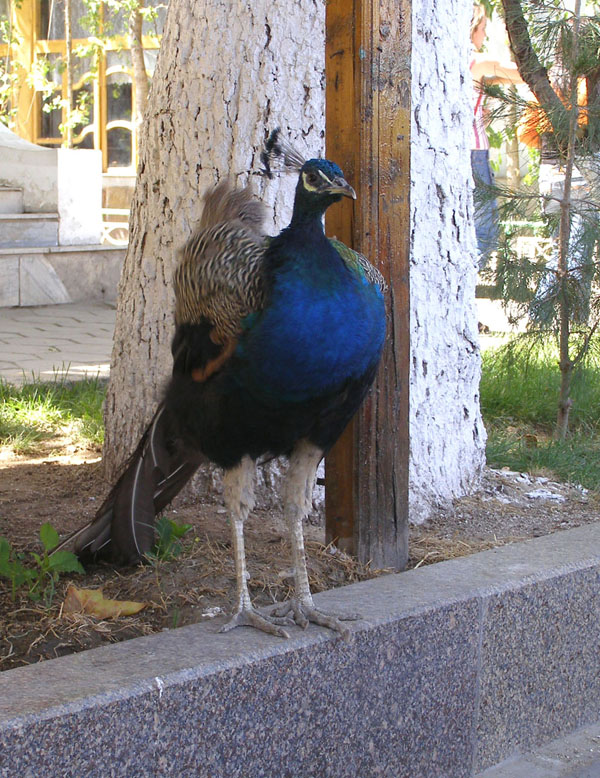 На газоне стоит клетка с павлинами. И вот этот самостоятельный павлин гуляет самостоятельно. Уж не знаю, что его держит. Возможно, то, что в клетке - самочки и корм. Хлеб и зрелища. :)