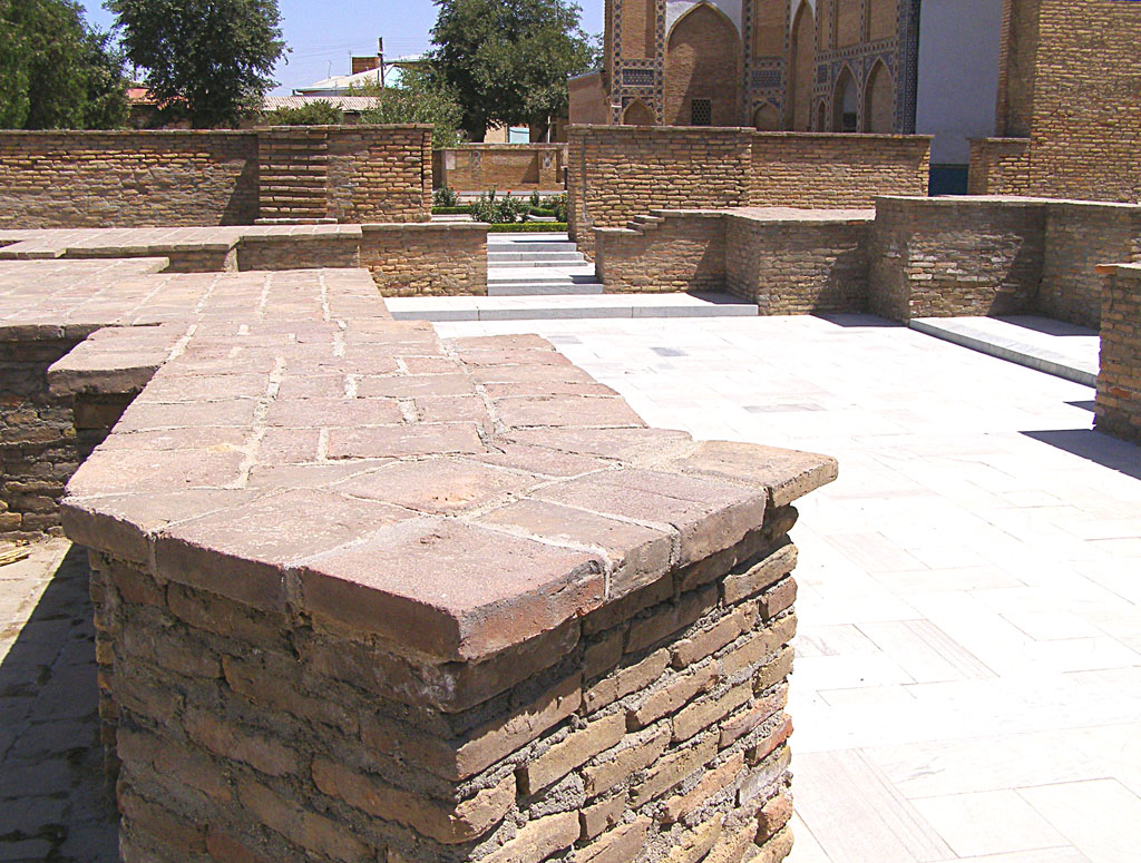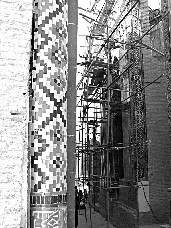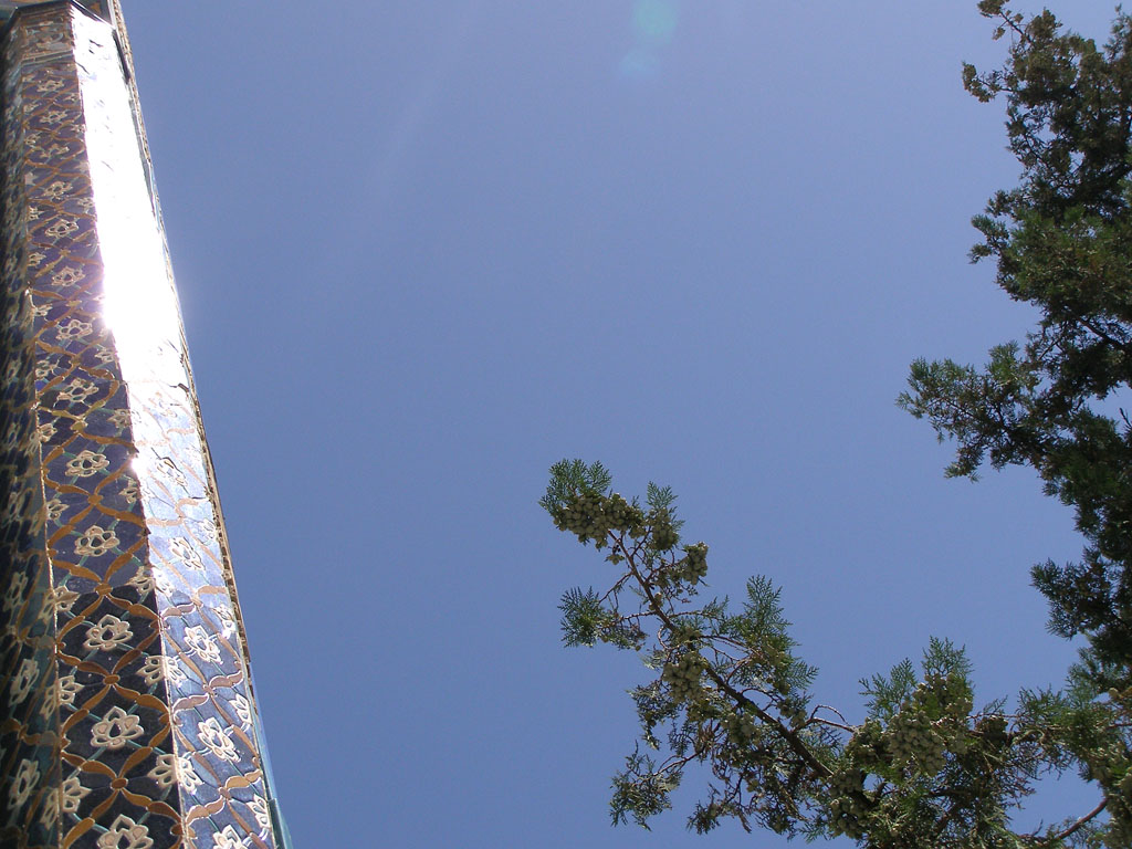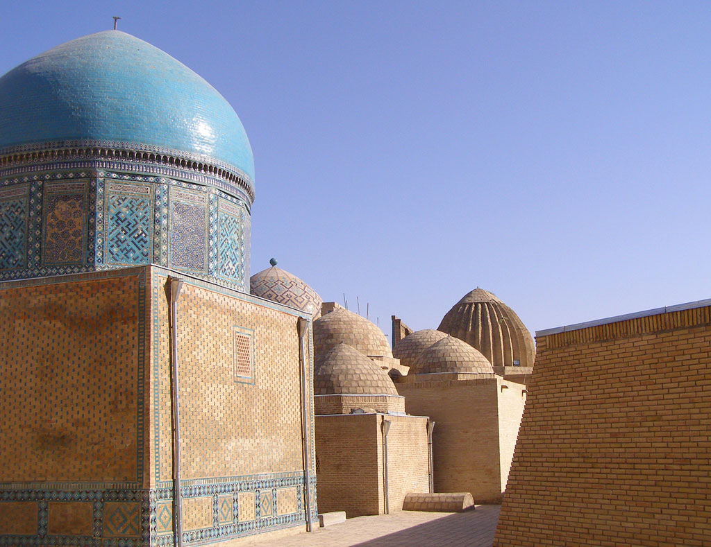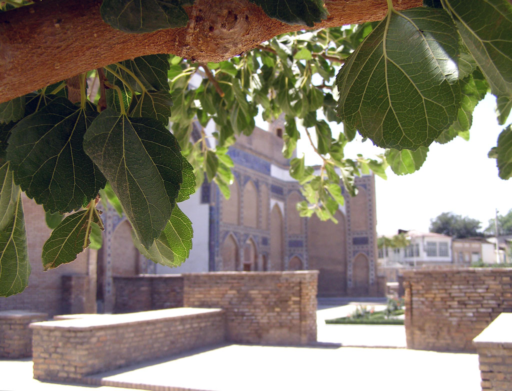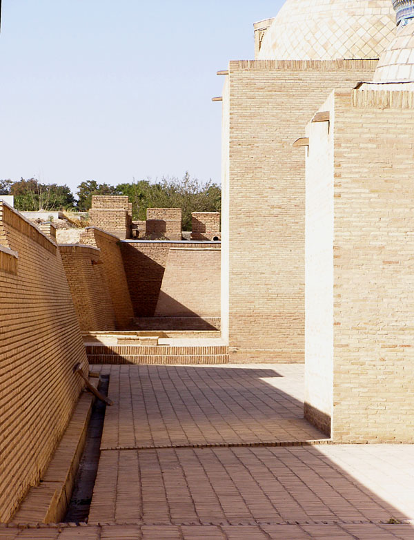 Не дошли до Афросиаба (не там свернули). Гуляли по сложному комплексу мавзолея «Шакх-и-Зинда». Яркое появление архитектуры с тесными проходами, лесенками, контрастными тенями, куполами, мавзолеями. Напоминает загадочность замка из фильма с Дэвидом Боуи «Лабиринт». В неожиданных местах встречаются групы надгробий. Зародилась мысль начинать фотографировать всё это по-другому. Как-то иначе.
