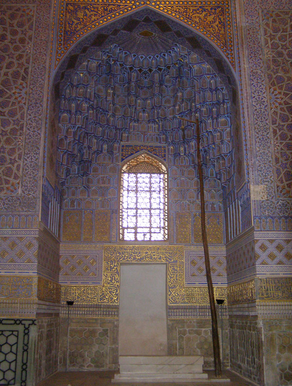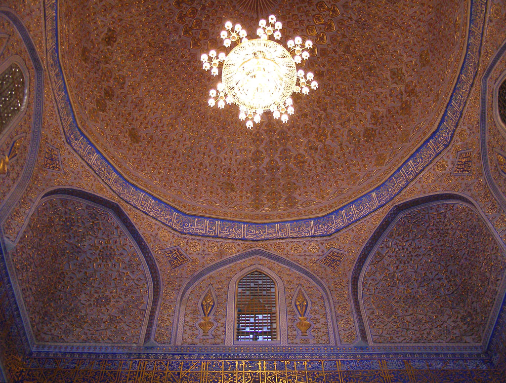 Мавзолей Тимура изнутри. Вообще говоря, немного мазволеев оформлены так богато и тонко. Тимур и Улукбек - очень удачно "вспомненные и раскрученные" образы национальных героев Узбекистана. Как я понимаю, вспомненные после ухода в никуда идолов вроде Ленина и т.п. Обязательно есть улицы имени Амира Тимура или Мирзо Улугбека. Каждый из них действительно был велик.