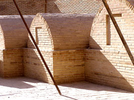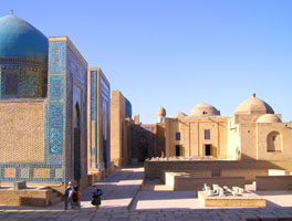 Комплекс мавзолеев Шакх-и-Зинда. Кругом - реконструкция и восстановление. Необычно гулять по таким вот улочкам с чёткой геометрией. Синее небо, жёлтые стены, контрастные тени, страшное пекло - это очень необычно.